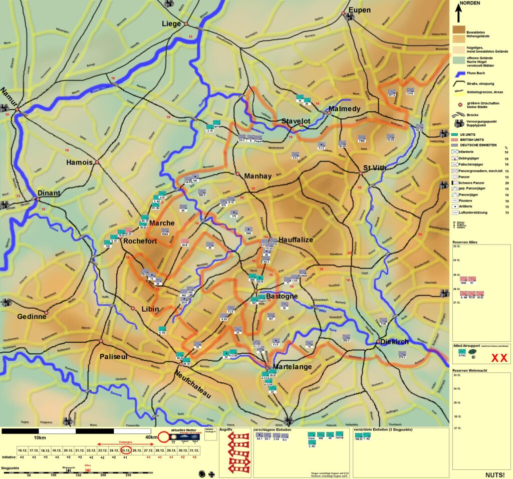 Daniel hat wieder die Aufgabe der Organisation übernommen – vielen Dank dafür – und sowohl die Regeln und die Karte vorbereitet. Die Kampagne wird den Zeitraum vom 23. bis zum 27.12.44 umfassen und jeweils 5 Spiele je Tag umfassen. Derzeit prüfen wir das System mit Testrunden.