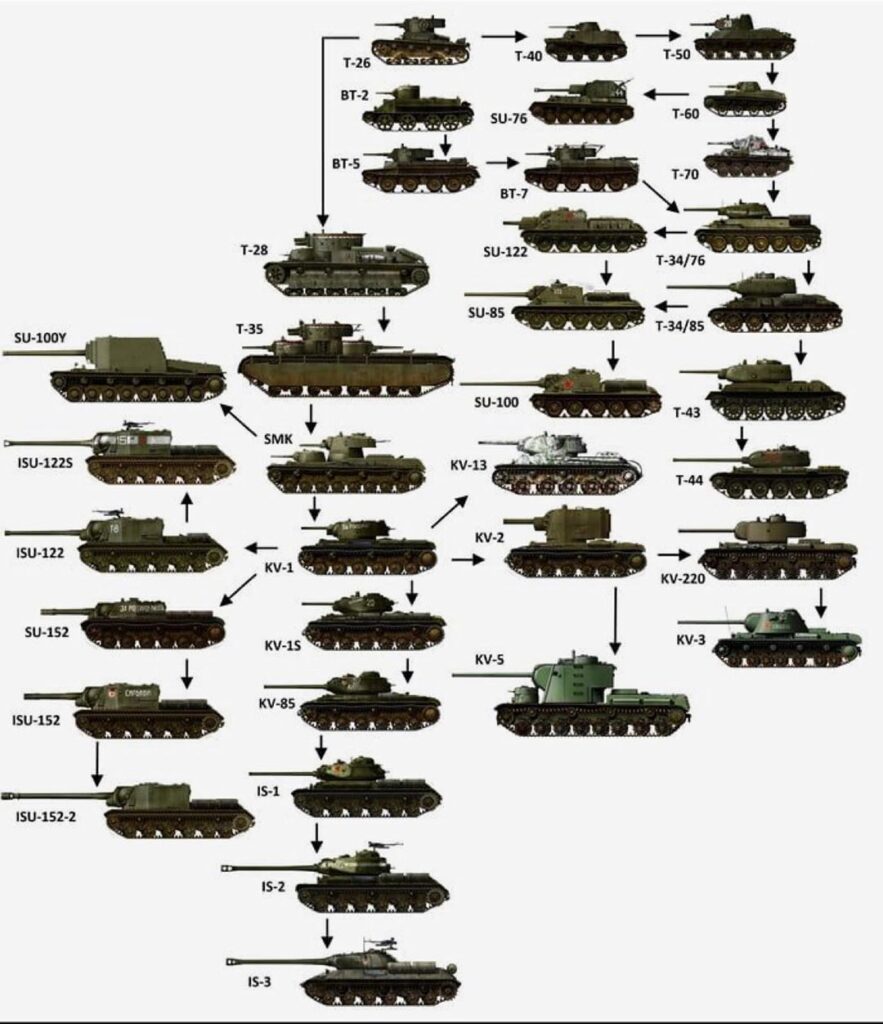 Beim Stöbern durchs Netz ist mir diese Grafik in die Hände gefallen, die ich euch nicht vorenthalten möchte: ein schöner Stammbaum der sowjetischen Panzerentwicklung, vom kleinen T-26 der Vorkriegszeit bis hinunter zum bulligen IS-3. Für jemanden, der gerne rote Stahlkolosse über den Tisch schiebt, ist das fast wie ein Tech-Tree im Computerspiel – nur eben in historisch.