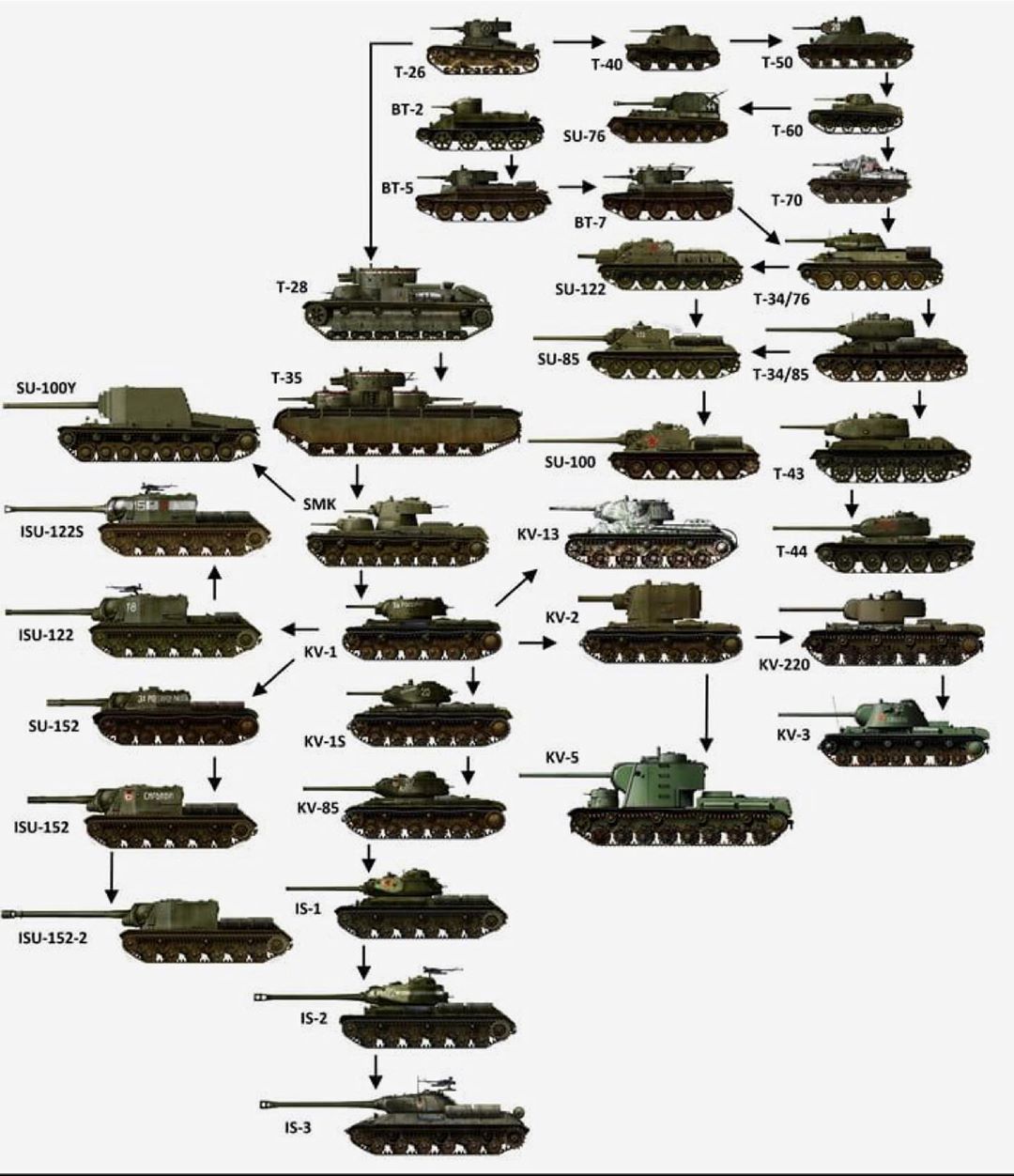 Ganz oben links fängt alles mit dem T-26 und den BT-Panzern an. Das sind typische Zwischenkriegs-Konstruktionen mit vielen Nieten, dünner Panzerung und dafür ordentlich Geschwindigkeit. Aus diesen frühen Versuchen wachsen dann sowohl die Mehrturm-Monster T-28 und T-35 als auch später die bekannteren Fahrzeuge. Man sieht schön, wie die Idee „mehr Türme hilft mehr“ irgendwann zugunsten besserer Panzerung und eines vernünftigen Hauptturms aufgegeben wird.
