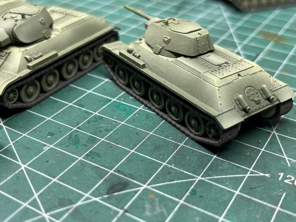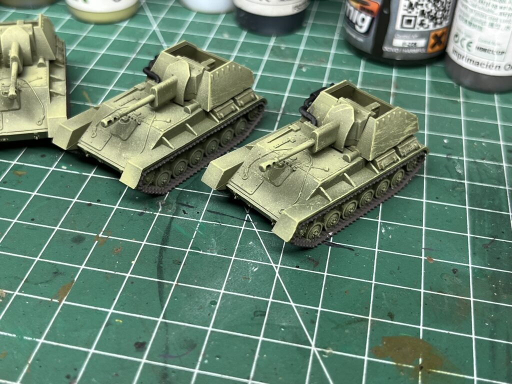 Als erste Panzerjäger der Sovjets sind nun die SU-76 auf dem Maltisch. Den Anschluss werden 11 frühen T-34 bilden. Beide Einheiten sind soweit vorbereitet und Ketten sind bemalt. Bei den SU-76 müssen noch die Laufrollen bemalt werden.
