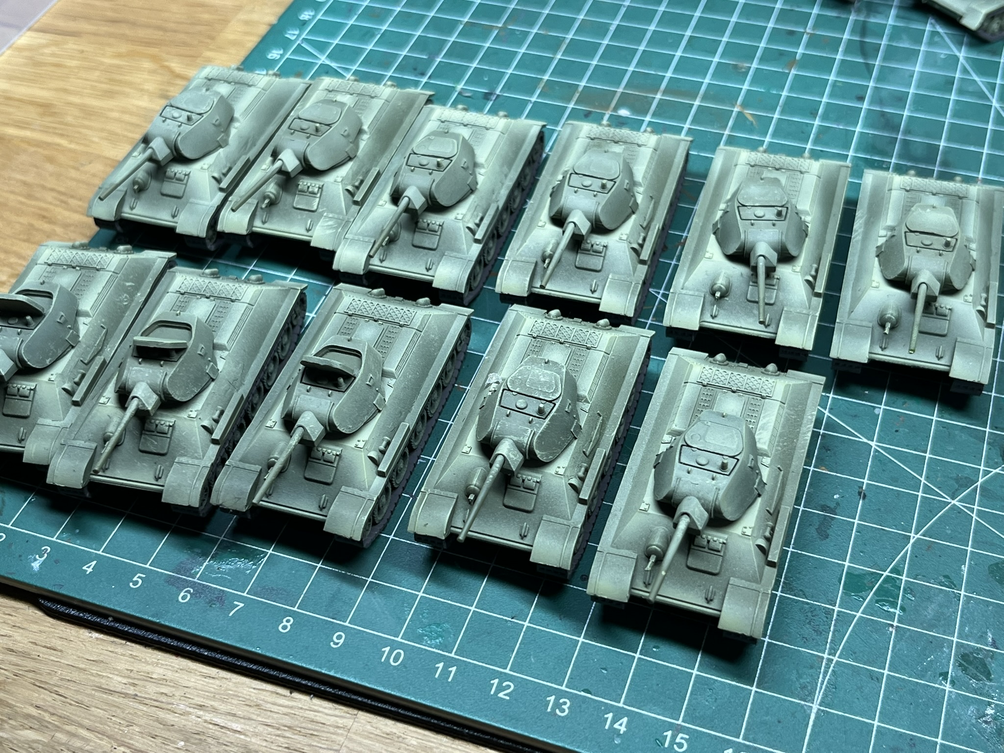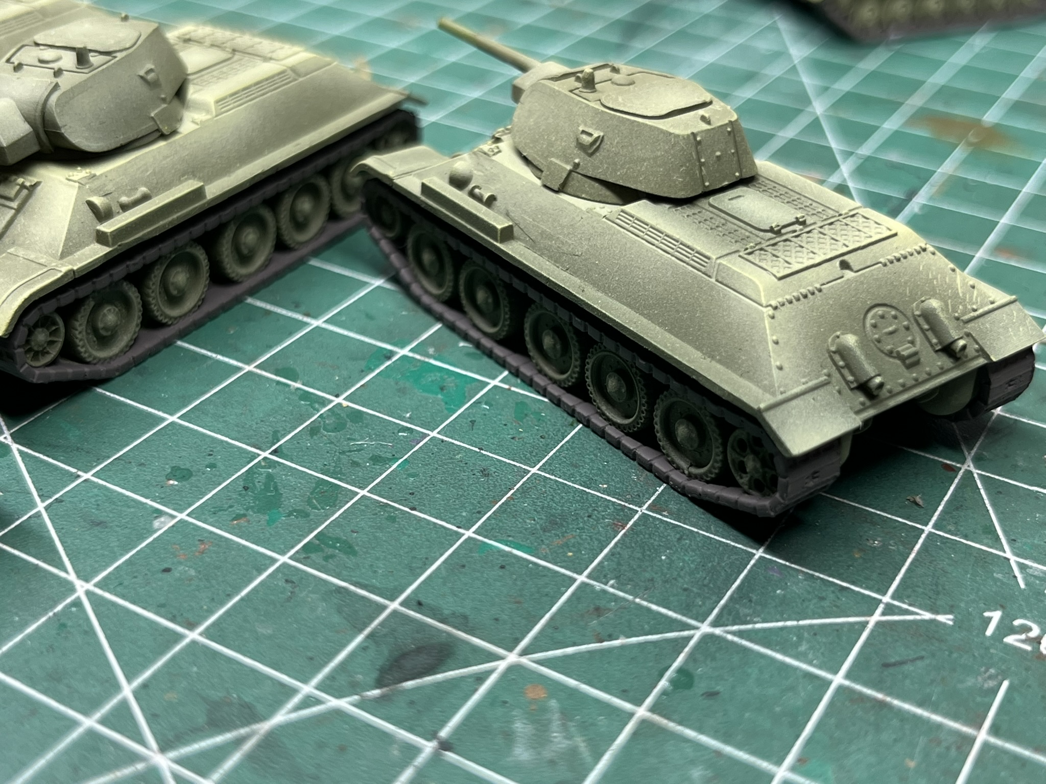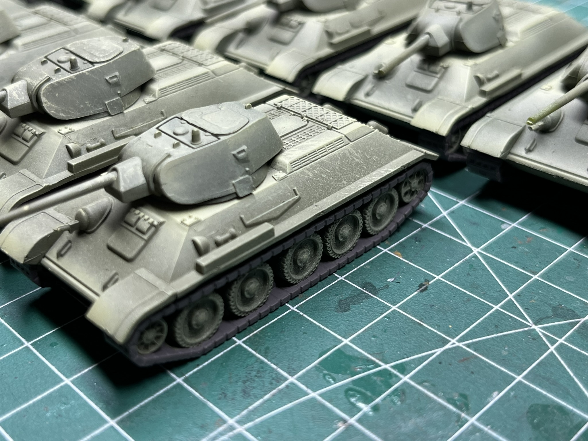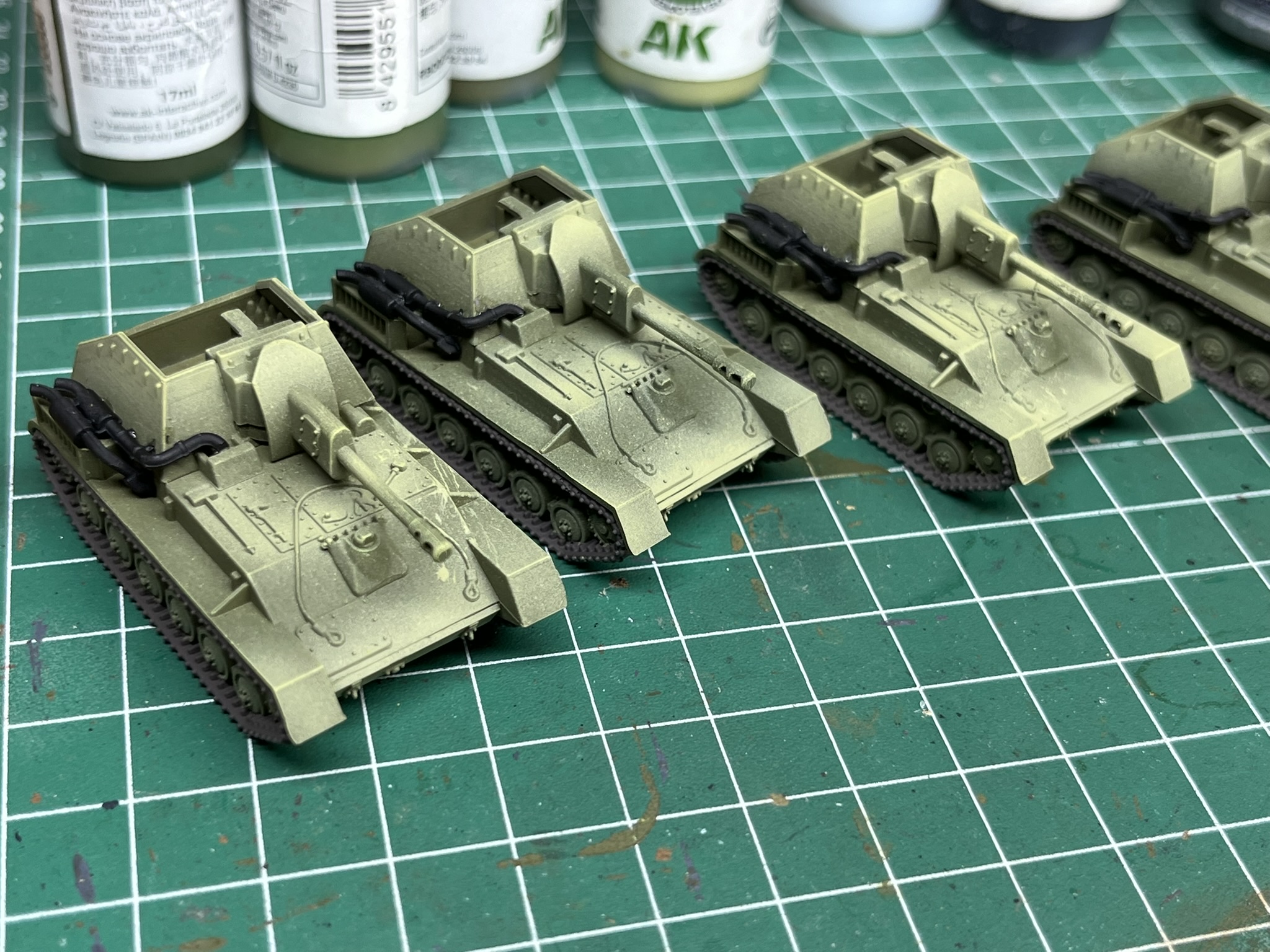 Als erste Panzerjäger der Sovjets sind nun die SU-76 auf dem Maltisch. Den Anschluss werden 11 frühen T-34 bilden. Beide Einheiten sind soweit vorbereitet und Ketten sind bemalt. Bei den SU-76 müssen noch die Laufrollen bemalt werden.