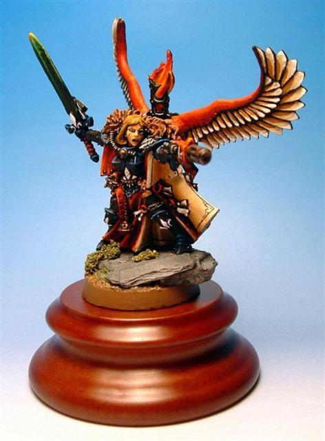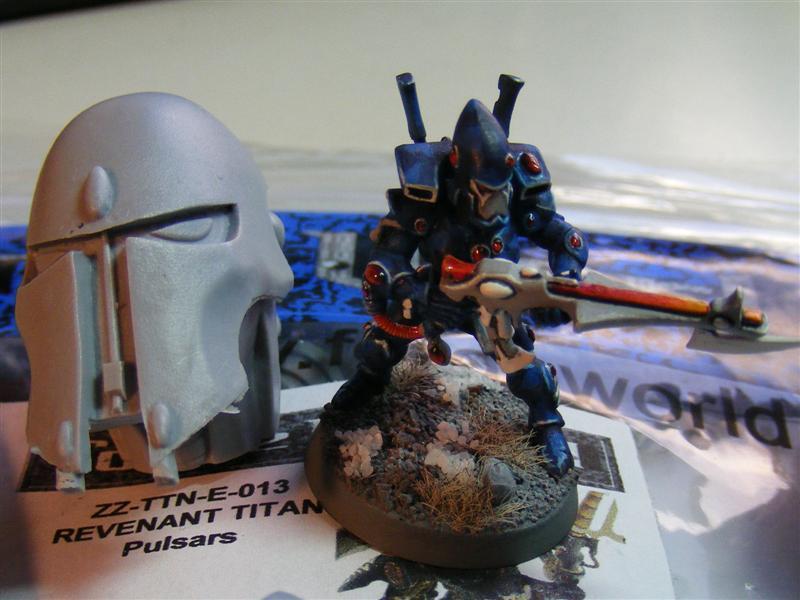 Die Kristalle an Helm und Kragen werden in Grüntönen bemalt. Dabei beginnt man mit der Farbe Dark Angels Green und trägt diese auf ca. 2/3 des Kristalles auf. Das obere Drittel läßt man (rund) schwarz. Nach unten hellt man nun das Dark Angels Green zuerst mit Snot Green und danach mit Goblin Green auf. Ganz unten kommt ein heller Punkt in Scorpion Green.
