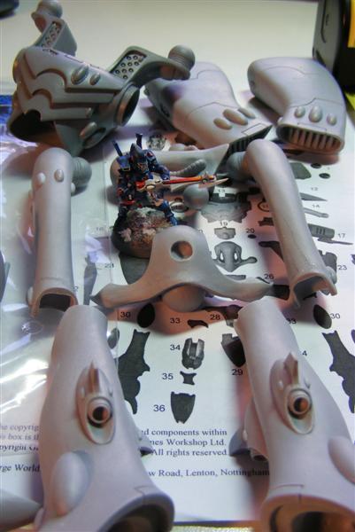 Als Basis wird ein normaler Panzer der Imperialen Armee herangezogen (in diesem Fall sogar 6 Stück), welcher mit GW Chaos Black grundiert wurde. Der gesamte Panzer wurde dann mit Tamiya Nato Black komplett besprüht.