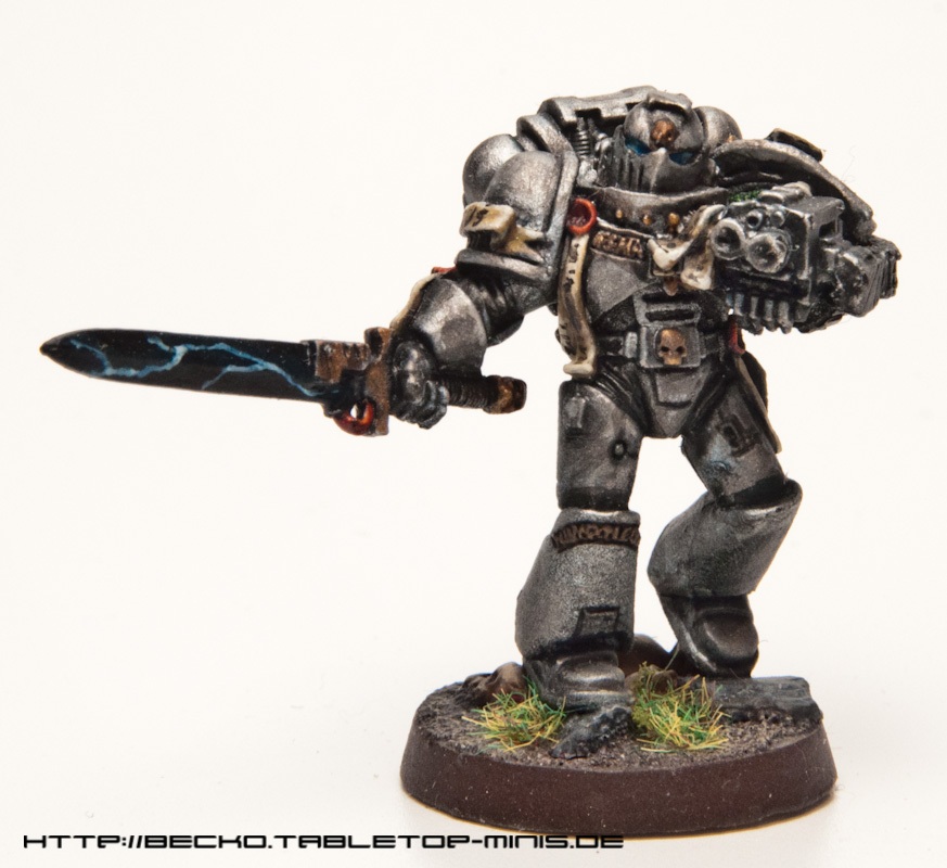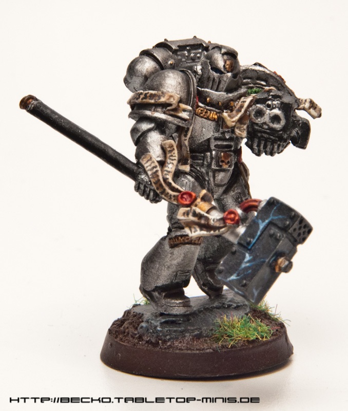 Danach wird die komplette Miniatur mit einer Mischung aus schwarzer Ölfarbe und White spirit gewashed (Alternativ kann auch Badab Black benutzt werden). Nach dem Trocknen nochmal mit White Spirit von oben nach unten abgebürstet. Zur Akzentuierung können die Kanten nochmal mit einer Mischung aus Ivory und Boltgun Metal gebürstet werden.