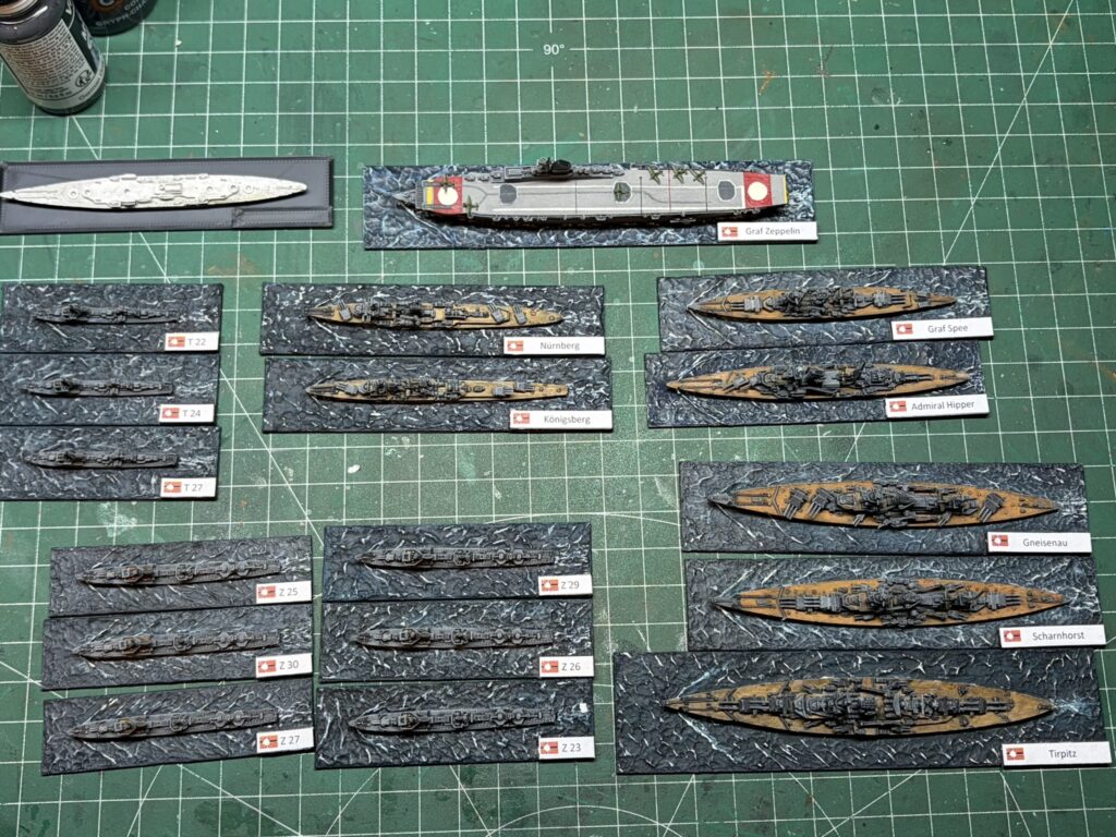 Nach dem letzten Spiel gegen Dappy habe ich mich dazu entschlossen meine Modelle der Kriegsmarine noch mal zu überarbeiten. Heller Highlights, Flugzeuge umbemalt und Änderungen an der Bemalung der Decksaufbauten stehen an. Final werden die Schiffkennzeichen ebenso überarbeitet und durch neue ersetzt.