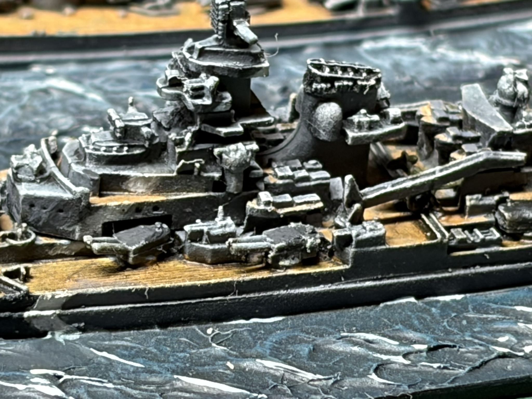Danach wird die Wasser Texture von Vallejo aufgetragen und vorsichtig mit dem Pinsel Bug- und Heckwelle geformt. Danach mit Ivory bürsten, ggf. noch aml Dark Sea Blue oder auch eine blaue Wash auftragen.